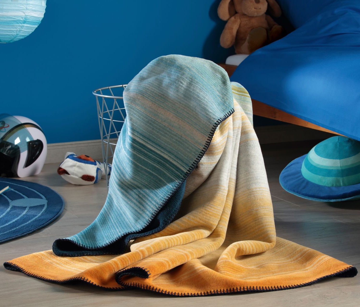 Die Kinderdecke „Galaxies“ begeistert mit ihrem abwechslungsreichen Wendedesign: Eine Seite zeigt feine Streifen in sonnigem Gelb und Hellblau mit lebendigem Farbverlauf, die Rückseite überzeugt in elegantem Dunkelblau. Dieser spannende Kontrast macht die Decke zu einem echten Hingucker in jedem Kinder- oder Jugendzimmer.