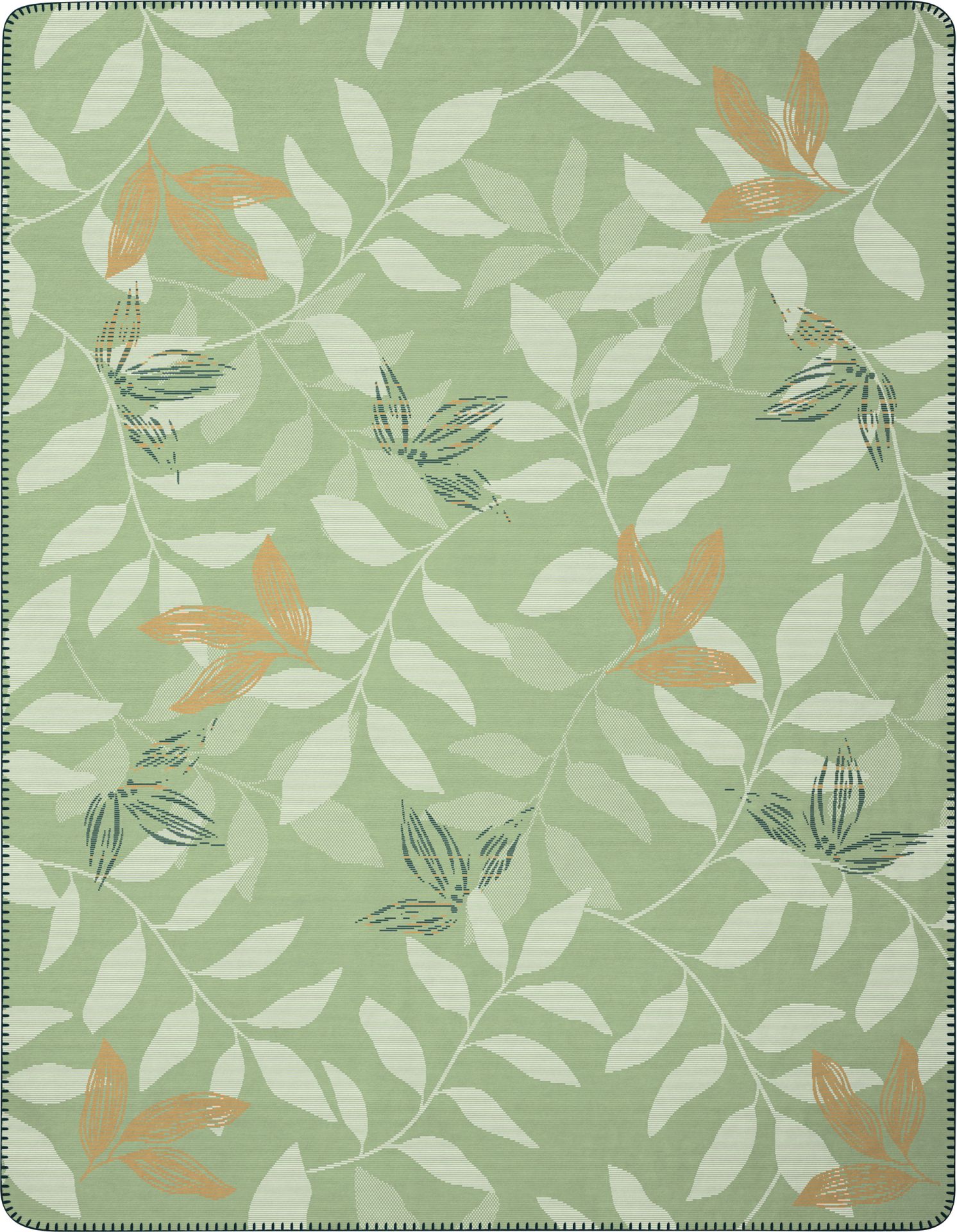 Bringen Sie die Schönheit der Natur in Ihr Zuhause mit der Biederlack Wohndecke "Greenery". Das filigrane Blättermuster in sanften Grüntönen, kombiniert mit leuchtenden Akzenten in Orange und dunklem Blau, schafft eine stilvolle und zugleich gemütliche Atmosphäre.